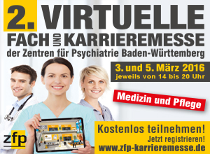 (firmenpresse) - Der Klinikverbund der Zentren für Psychiatrie (ZfP) Baden-Württemberg geht nach erfolgreicher bundesweiter Veranstaltung mit einer zweiten virtuellen Fach- und Karrieremesse am 3. und 5. März 2016 ins Rennen um Bewerberinnen und Bewerber:
