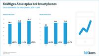 Die Nachfrage nach Smartphones hat im vergangenen Jahr noch einmal kräftig angezogen. 2015 wurden in Deutschland 26,2 Millionen Geräte verkauft, das ist ein Plus von 7,4 Prozent gegenüber dem Vorjahr. Der Umsatz stieg sogar um 22 Prozent auf 10,3 Milliarden Euro und knackte damit erstmals die symbolische Marke von 10 Milliarden Euro. Das berichtet der Digitalverband Bitkom auf Grundlage aktueller Prognosen des European Information Technology Observatory (EITO). ?Der Smartphone-Boom ist ungebrochen?, sagt Dr. Hannes Ametsreiter, Mitglied des Bitkom-Präsidiums. ?Obwohl die meisten Geräte schon sehr ausgereift sind und durch Software-Updates laufend aktualisiert werden, werden neue Modelle für Verbraucher immer interessanter.? Dies hänge zum Beispiel mit dem Trend zu größeren Displays, mit neuen Funktionen wie der Bezahlung per Handy und starken Verbesserungen, z.B. bei der Kameraleistung und Akkulaufzeit zusammen. ?Das Smartphone ist zur Steuerungszentrale für viele Bereiche des täglichen Lebens geworden ? sei es um Freundschaften in sozialen Netzwerken zu pflegen, Termine zu organisieren oder um Einkäufe und Bankgeschäfte schnell und bequem von unterwegs zu erledigen. Entsprechend groß sind die Ansprüche an die Geräte, und die Verbraucher sind bereit, in Leistung und Komfort zu investieren.? So lag der Durchschnittspreis eines Smartphones 2015 bei 395 Euro, im Jahr zuvor waren es erst 348 Euro. Befeuert wurde der Markt im vergangenen Jahr zudem durch die Einführung neuer Modelle großer Hersteller wie das iPhone 6 oder das Samsung Galaxy S6. Ametsreiter: ?Der Smartphone-Boom geht den Bitkom-Prognosen zufolge auch 2016 weiter.? So werden im laufenden Jahr voraussichtlich 28,2 Millionen Geräte verkauft, das ist ein Plus von 7,5 Prozent im Vergleich zu 2015. Der Umsatz soll bei rund 10,4 Milliarden Euro liegen. Der Durchschnittspreis für ein Smartphone würde damit wieder etwas sinken, auf 370 Euro.