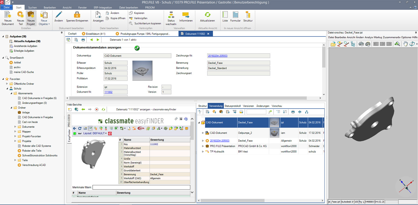 Bildunterschrift: Die nahtlose Integration vom classmate easyFINDER in PRO.FILE ermöglicht einfache Recherche von CAD-DatenWeitere Infos zu dieser Pressemeldung: