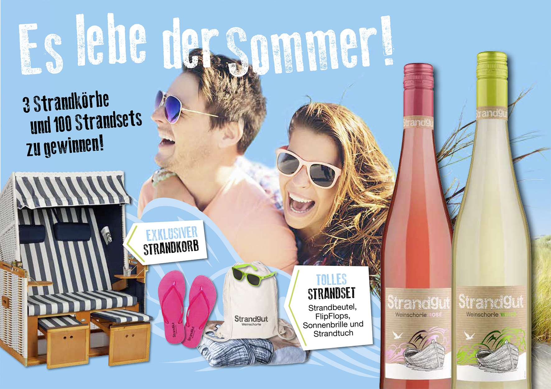 (firmenpresse) - Strandgut läutet den Sommer ein: Unter dem Motto "Es lebe der Sommer!" verlost die Weinschorle 100 gebrandete Beach-Sets inklusive Strandbeutel, Flip Flops, Strandtuch und Sonnenbrille. Als Hauptpreis gibt es einen von drei Strandkörben zu gewinnen - für Beach-Feeling im eigenen Zuhause.