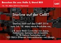 Starline zeigt auf der CeBIT 2016 vom 14.-18. März neue Produkte, z.B. neue RAID-Controller von Areca, NASdeluxe-Systeme mit JovianDSS, 10 TB Helium Festplatten und 100 Gbit/s Ethernet Netzwerkkarten von QLogic.