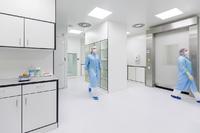 Die Wand-und Deckenkonstruktion ist flächenbündig ausgeführt und leicht zu reinigen. Der Zugang erfolgt über Personal- und Materialschleusen. Diese verfügen über gegenseitig miteinander verriegelte Schleusentüren. Auf diese Weise wird das gleichzeitige Öffnen von Türen einer Schleuse verhindert. So ist der hinsichtlich des Raumklimas kritische Arbeitsbereich sicher von der Umgebung abgeschottet. Durch eine elektronische Zutrittskontrolle wird der Zugang zu den Reinraum und Laborbereichen für die zugelassenen Personen geregelt.