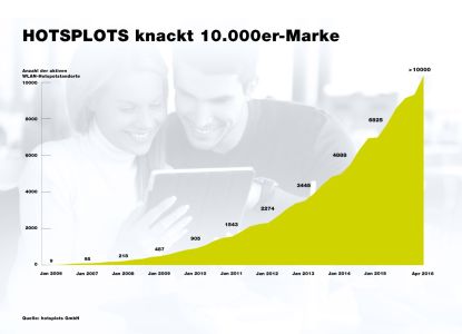 (firmenpresse) - Berlin, 15. April 2016 - Die hotsplots GmbH, einer der Marktführer für drahtlose Internetkommunikation, hat kürzlich den zehntausendsten Hotspotstandort freigeschaltet. Damit setzt der Berliner WLAN-Spezialist seinen 2004 begonnenen Erfolgskurs auf beeindruckende Weise fort. Beteiligt an diesem Erfolg sind die in ganz Deutschland ansässigen über 300 Installations- und Service-Partner, die vor Ort die Kunden von HOTSPLOTS betreuen.