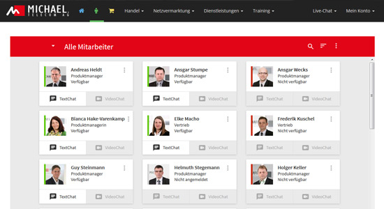 MICHAELTELECOM AG nutzt ProCall LiveChat als Kontakt Portal mit aktuell 25 Mitarbeitern, die nach "außen hin" jetzt für Interessenten, Kunden und Partner sichtbar sind. Seinen Einsatz findet das Kontakt Portal aktuell im Shop sowie im Kundencenter von MICHAELTELECOM AG. Ronny Jarysek, Produktmanager bei MICHAELTELECOM AG sagt über die neue Kommunikationsmöglichkeit zu den Kunden: "Seit Februar diesen Jahres können alle Kunden der MICHAELTELECOM AG auf unserer Webseite den estos ProCall LiveChat nutzen. Wir sind davon überzeugt, dass wir dem Fachhandel mit dieser modernen Kommunikationsmöglichkeit einen einzigartigen Service bieten, um so noch gezielter an Informationen zu gelangen. Mit der LiveChat-Funktion sehen unsere Kunden sofort, ob ihre Ansprechpartner "verfügbar" sind und können diese direkt aus unserer Webseite heraus persönlich ansprechen. Das spart Zeit und ist ein PLUS an Service für unsere Fachhändler! "