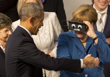 Bundeskanzlerin Angela Merkel nach einer Hand im digitalen Raum.