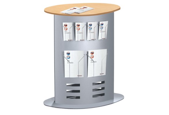 (firmenpresse) - Die Messetheke METAL ist eine platzsparende, kompakte Informations- und Präsentationstheke im trendigen Ovaldesign. Gefertigt aus solidem, pulverbeschichteten Metallblech mit einer Buchedekor-Holzdeckplatte. Die METAL-Serie umfasst neben der Infotheke auch unterschiedlich dimensionierte Infosäulen im Ovaldesign mit variabel platzierbaren Plakattaschen und Prospektdrahthaltern.