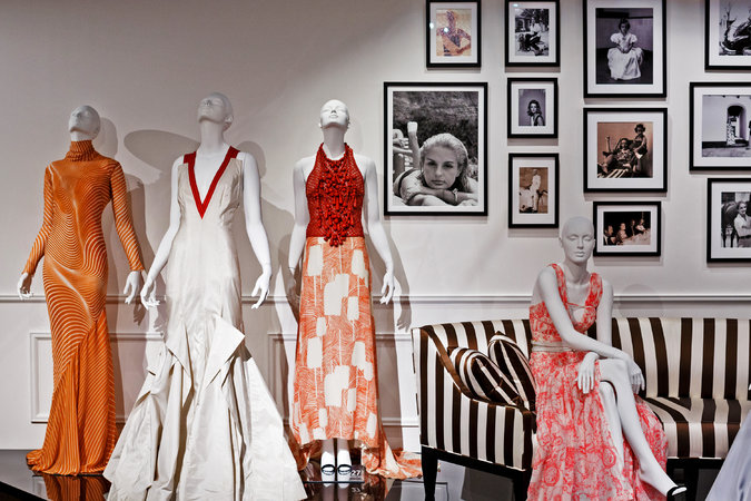 Angezeigt auf einer Reihe von Alabaster Mannequins sind die roten Teppich Dazzlers, die ihre Relevanz bezeugen: der Kohl Rosenmuster Kleid von Lucy Liu an den 2013 Golden Globes getragen; die roten und schwarzen hastete faille Taylor Swift auf das gleiche Ereignis trug das folgende Jahr; und die Röte-Ton-Schlupf eines Kleides, seine hemline Pooling auf dem Boden, dass Lady Gaga trug bei der 2016 Producers Guild of America Awards.