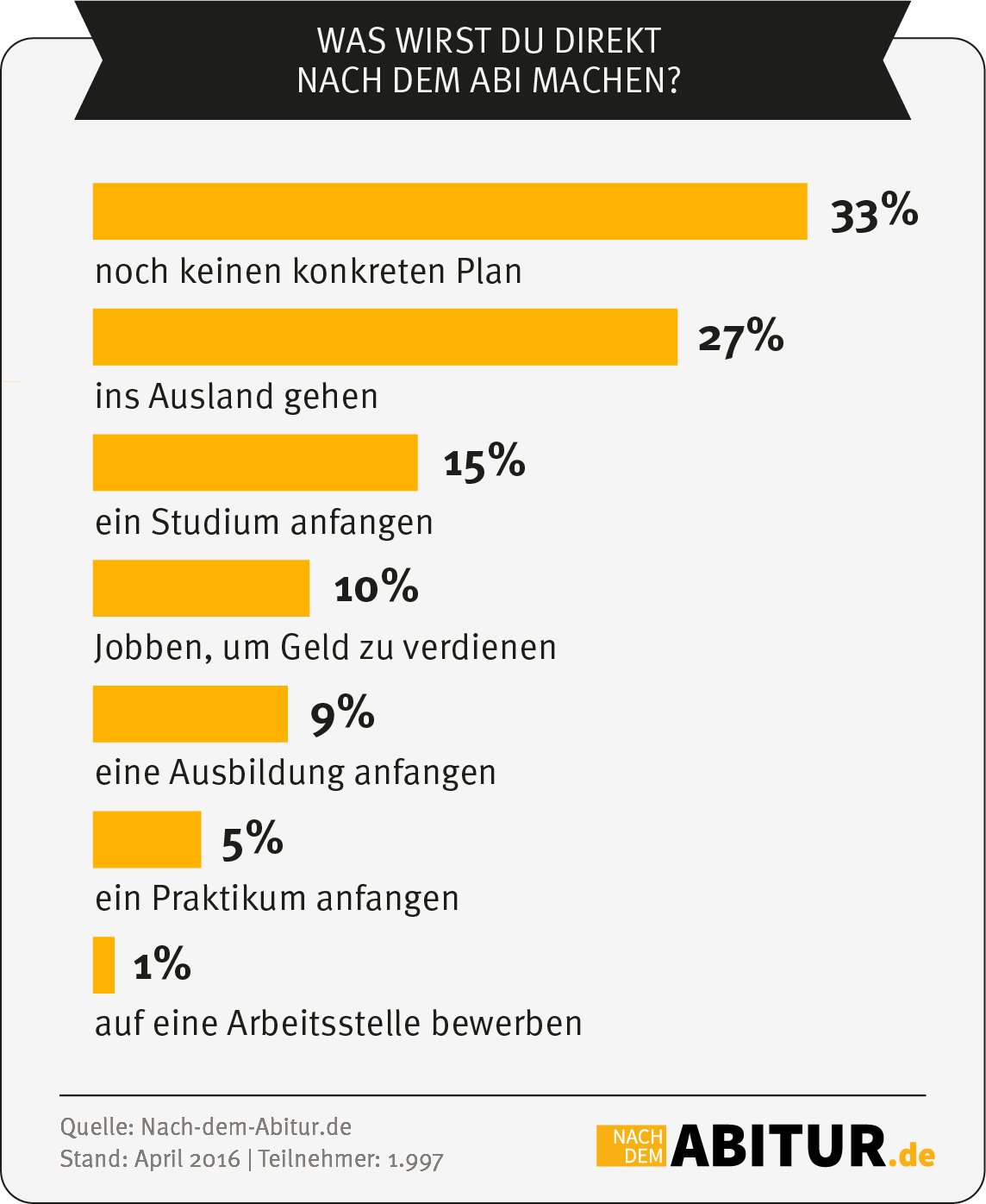 Mit 33 Prozent gab nahezu ein Drittel der 1.997 Umfrageteilnehmer an, noch keinen konkreten Plan für die Zeit nach dem Abitur zu haben. Ein Anteil von 27 Prozent entschied sich für einen Auslandsaufenthalt, während 15 Prozent ein Studium beginnen wollen. Erst einmal Geld verdienen möchten 10 Prozent der Schulabgänger und planen, sich nach dem Abschluss der Schule einen Job zu suchen. Nur 9 Prozent möchten eine Ausbildung beginnen und weitere fünf Prozent der Befragten planen ein Praktikum. Ein Prozent der Befragten will sich direkt auf eine Arbeitsstelle bewerben.
