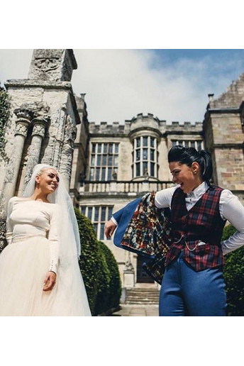 In einem Schuss auf Twitter, ist Lucy gesehen in einem Tartan Weste und blaue Anzughose posieren, während ihre Frau in einem clasic weiße Hochzeitskleid , komplett mit Kopfbedeckung und Schleier, mit einer brenn-up 'Just Married' Schild über sie glamourös aussieht sowohl .
