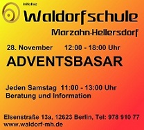 Die LehrerInnen, SchülerInnen, Eltern und Freunde der Waldorfschule Marzhan-Hellersdorf freuen sich, Ihnen mitteilen zu können, dass der erste Adventsbasar der Waldorfschule Marzahn-Hellersdorf am 28.11.2009 in der Elsenstraße 13a, 12623 Berlin in der Zeit von 12.00 Uhr bis 18.00 Uhr stattfinden wird.