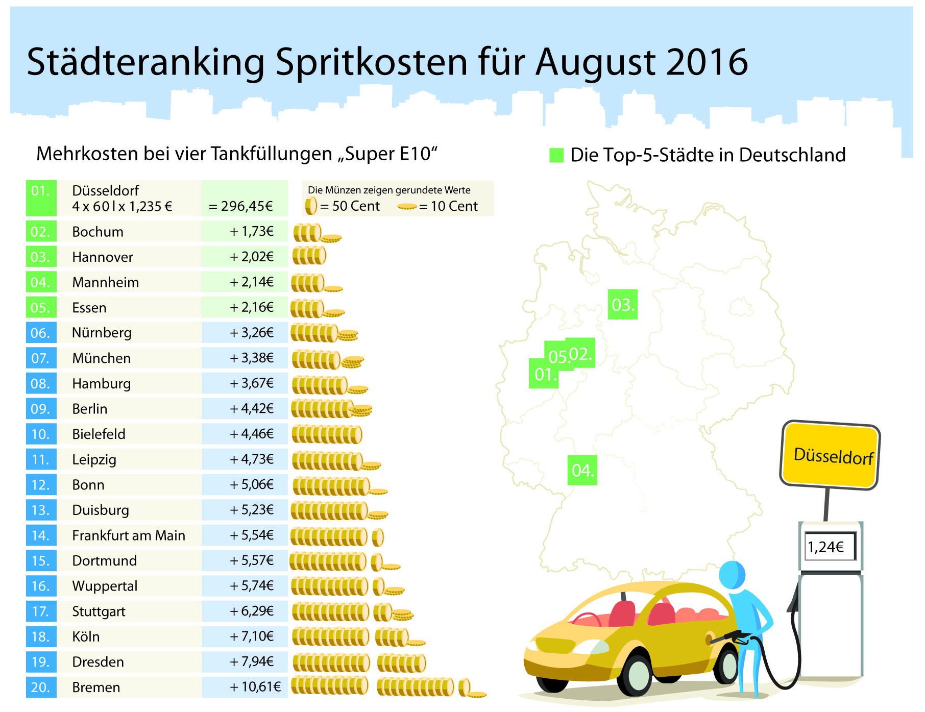 Entsprechend des monatlichen clever-tanken-Rankings der 20 größten Städte Deutschlands tankten Autofahrer Super E10 am günstigsten in Düsseldorf (1,2352 Euro pro Liter), Bochum (1,2424 Euro) und Hannover (1,2436). Auch Dieselfahrer sparten in diesen drei Städten am deutlichsten. So zahlten die Düsseldorfer durchschnittlich 1,0298 Euro pro Liter, die Bochumer 1,0424 Euro und die Hannoveraner 1,0427 Euro.