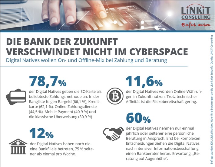 "Bank der Zukunft verschwindet nicht im Cyberspace / Studie von LiNKiT zeigt: Digital Natives wollen On- und Offline-Mix bei Zahlung und Beratung (FOTO)"