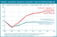 Diese hohen Wachstumserwartungen spiegeln die überdurchschnittliche Dynamik wider, die Produktion und Umsatz der Branche seit 2008 durchlaufen haben. So zeigt einer weiterer Branchenreport auf, dass Stückzahlen und Wert der Maschinen in Robotik und Automation seit 2008 um 50% gestiegen sind. Demgegenüber liegt das Umsatzwachstum im Maschinenbau bei 3%, die Produktion bei minus 7%.