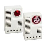 Der neue Hygrostat schaltet die eingebauten Ventilatoren oder Heizungen ein bzw. aus, sobald der gewählte Wert der Luftfeuchte im Schrank erreicht worden ist. Über eine optische Betriebsanzeige wird der Status signalisiert. Die integrierte LED leuchtet, wenn der angeschlossene Verbraucher (Heizung) im Betrieb ist. Der Anschluß des Hygrostats erfolgt mit einen optionalen Stromkabel mit oder ohne IEC-Stecker, so dass ein anderer Stecker oder ein Direktanschluss gewählt werden kann. Über eine Schnappbefestigung für eine 35 mm DIN-Schiene EN 50022 kann der Hygrostat im Schrankinneren sehr einfach befestigt werden.