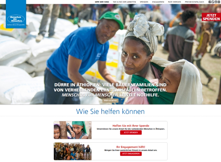 Die neue Menschen für Menschen-Homepage bietet den Usern nicht nur eine vielfältige und klare Orientierung auf einfache Spendenmöglichkeiten und Ideen für eigene Engagements. Auch übersichtliche Informationen zu den Arbeitsbereichen in Äthiopien und Deutschland können unkompliziert abgerufen werden. Ansprechende und aussagekräftige Fotos und Grafiken sowie eindrückliche Reportagen und Fotos aus der Sicht der Menschen, die von der Arbeit in Äthiopien profitieren, zeigen die Wirkung der Spenden.