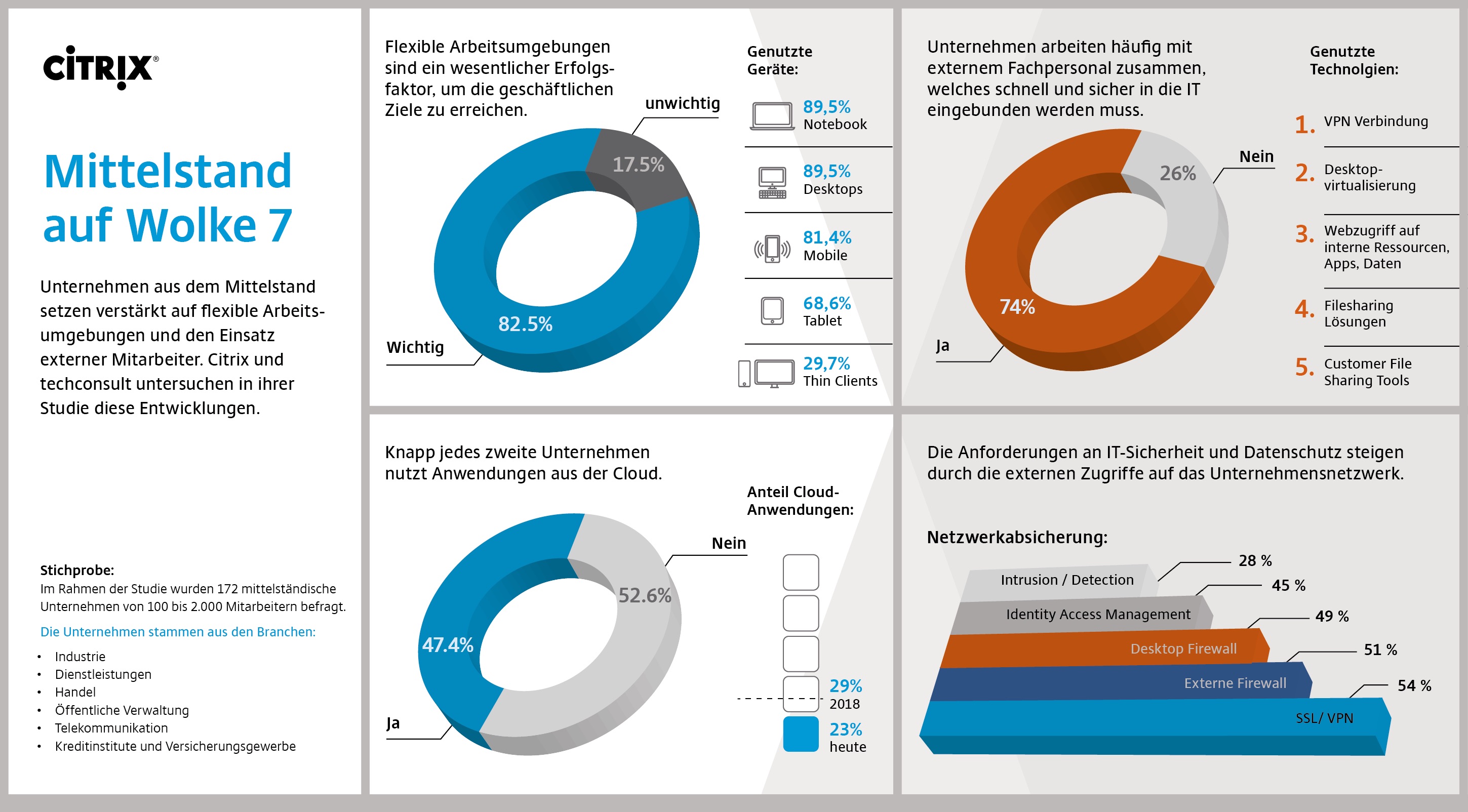 Die Kurzstudie wurde von techconsult im Auftrag von Citrix Systems im Juli 2016 durchgeführt. 172 Unternehmen des Mittelstandes von 100 bis 2.000 Mitarbeitern nahmen daran teil. Die Unternehmen stammen aus den folgenden Branchen: Industrie (36 Prozent), Dienstleistungen (22,7 Prozent), Handel (12,8 Prozent), Öffentliche Verwaltung (11,6 Prozent), Telekommunikation (8,7 Prozent) sowie Kreditinstitute und Versicherungsgewerbe (8,1 Prozent).