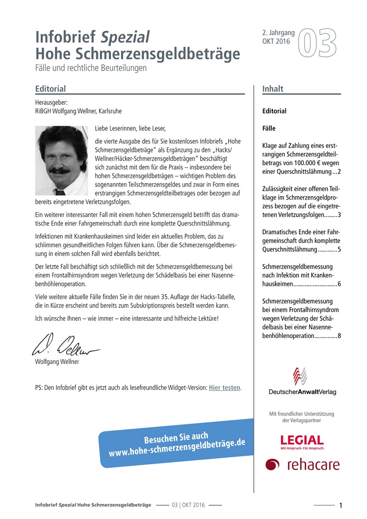 Wolfgang Wellner ist Richter des für das Schadensersatzrecht zuständigen VI. Zivilsenats des BGH und Mitherausgeber der im Deutschen Anwaltverlag erscheinenden Urteilssammlung "Hacks/Wellner/Häcker - Schmerzensgeldbeträge". Der Infobrief "Hohe Schmerzensgeldbeträge" erscheint alle drei Monate und kann gratis unter dem nachstehenden Link bezogen werden: