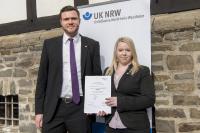 Bei der feierlichen Abschlussveranstaltung im Hagener Freilichtmuseum nahmen Patrick Feldmann und Jasmin Macha die Urkunde in Empfang. Die beiden sind direkt an dem guten Ergebnis beteiligt: Patrick Feldmann ist Sonderbeauftragter für Arbeitsschutz und -sicherheit des krz und Jasmin Macha betreut die vom krz eingesetzte und angebotene Unterweisungssoftware UWEB2000, die an die Gegebenheiten und Bedürfnisse der sie einsetzenden Verwaltungen und Unternehmen angepasst werden kann. So schult UWEB2000 z.B. auch die Beschäftigten im krz neben den Anforderungen im Arbeitsschutz zu besonderen Anforderungen, die im Datenschutz bei dem Lemgoer IT-Dienstleister bestehen.