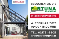 Das Familienunternehmen Fortuna Wintergarten - Marktführer im Rheinland für Wintergärten lädt zu den Sonderinformationstagen in die 1000 qm große Ausstellung und Wintergartenausstellung zwischen Köln und Düsseldorf. Jeweils von 09.00 -18.00 Uhr ist die Ausstellung an beiden Tagen geöffnet. Sonderaktionen, Winterpreise auf einige Produktgruppen, Vorstellungen der Neuheiten und Trends 2017 erwartet die Besucher.