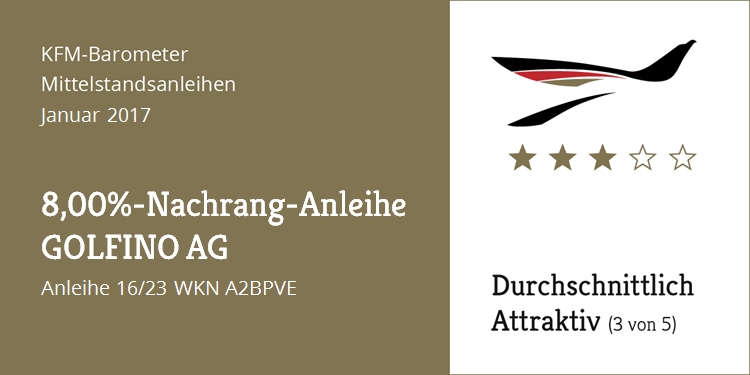(firmenpresse) - Düsseldorf, 19. Januar 2017 - In ihrem aktuellen Mittelstandsanleihen-Barometer zu der GOLFINO-Nachrang-Anleihe (A2BPVE) kommt die KFM Deutsche Mittelstand AG zu dem Ergebnis, die Anleihe als "durchschnittlich attraktiv" (3 von 5 möglichen Sternen) einzuschätzen.