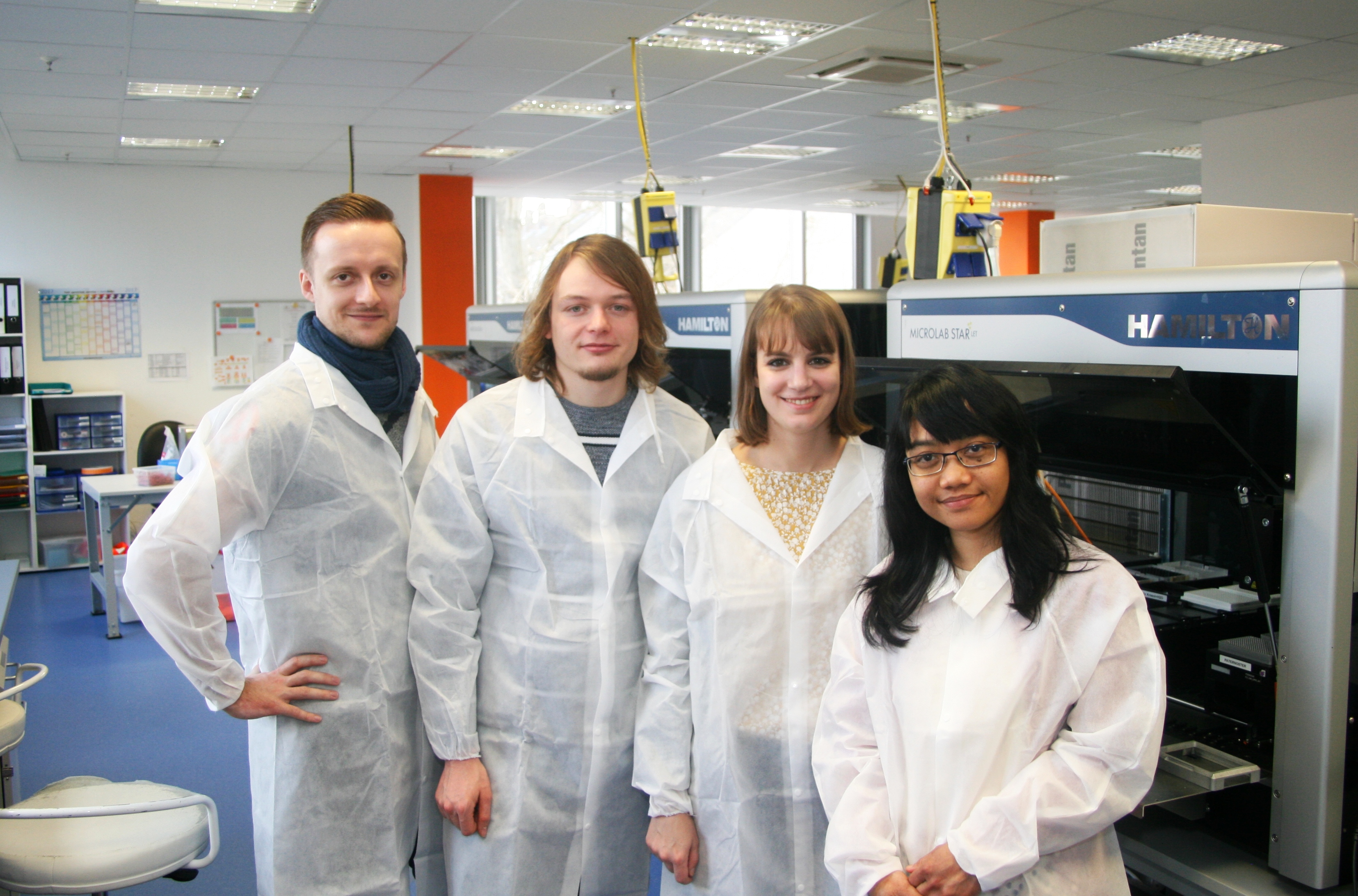 Schlembach und sein Team waren eingeladen, sich die vollautomatische Produktion der Sequenzen im Labor anzusehen. So waren sie auch verwundert über die technische Ausstattung, den Grad der Automation und die logistische Leistungsfähigkeit. Europaweit werden die Proben über Collection Points oder individuelle Logistiklösungen nach Köln ins Labor geschickt. Die Proben werden über Nacht bearbeitet und die Ergebnisse online bereitgestellt. ?Um diese Millionen von Aufträgen in der begrenzten Zeit bearbeiten zu können, benötigen wir einen ausgereifte Logistik, vollautomatisierte Prozesse, eine Vielzahl an Sequenzierplattformen, sowie ein gut ausgebildetes Team an Spezialisten. Unsere Labormitarbeiter arbeiten rund um die Uhr und stellen so die Lieferung hochqualitativer Daten binnen weniger Stunden sicher.?, so Herr Thomas Pankau, Deputy Site Manager European Custom Sequencing. Der Gewinner von der RWTH Aachen mit seinem Team erhielt einen Rundgang durch das Kölner Labor, einen Präsentkorb und eine Reihe von Freiaufträgen für seine Doktorarbeit.