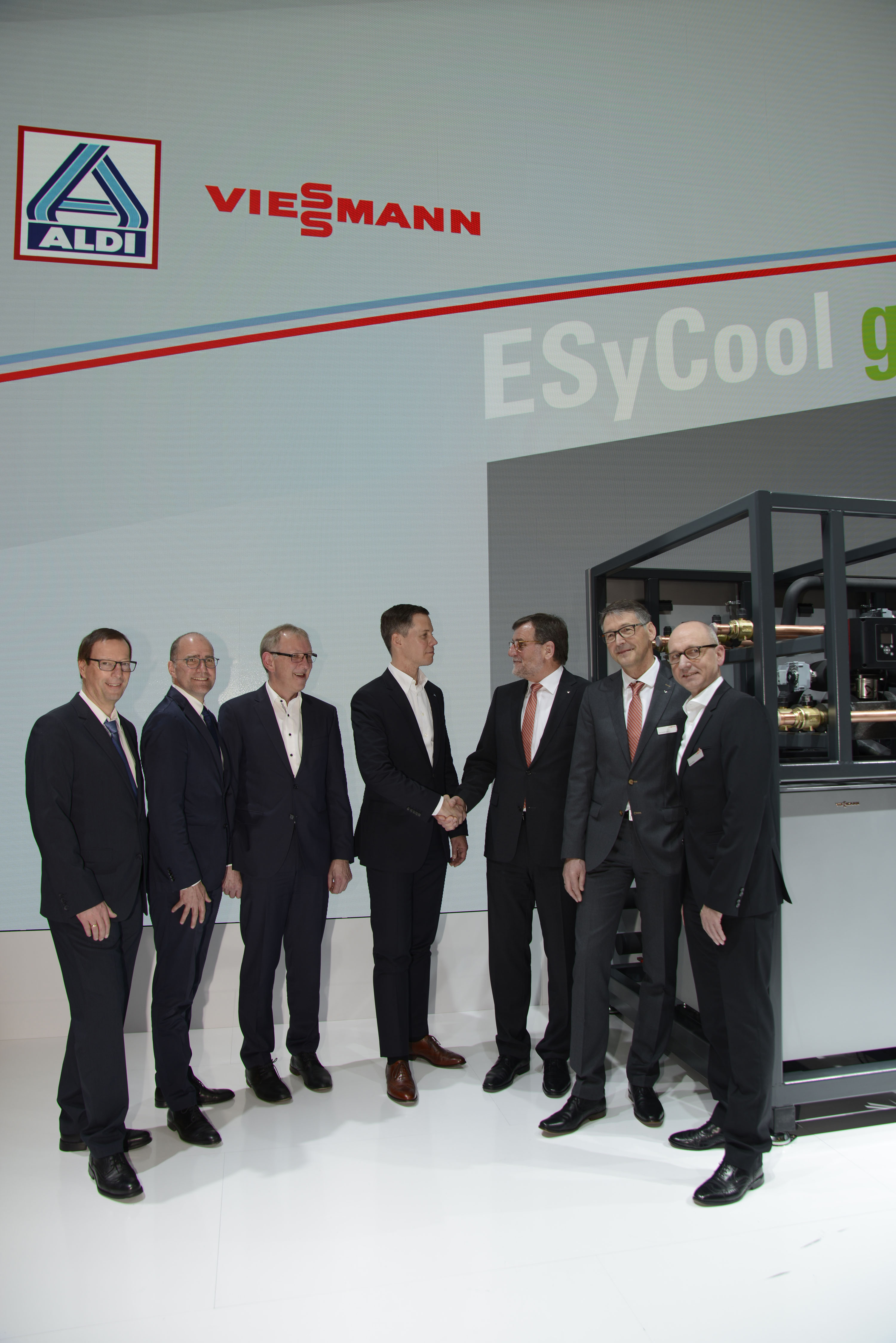 Gruppenfoto zur Kooperation von Viessmann und ALDI Nord, von links: Ulrich Schuberth, Projektmanager Coneer GmbH, Thomas Bader, Geschäftsführer Coneer GmbH, Heinz-Bernd Eden, Geschäftsführer ALDI Nord Gesellschaft Greven, Christian Fleck, Geschäftsführer ALDI Nord Gesellschaft Scharbeutz, Dr. Frank Schmidt, CEO der Viessmann Division Kühlsysteme, Jörg Straßburger, Geschäftsführer Viessmann Kühlsysteme GmbH, Edwin Bloch (bloch consulting). Foto: Martin Ernst/Viessmann/ALDI Nord