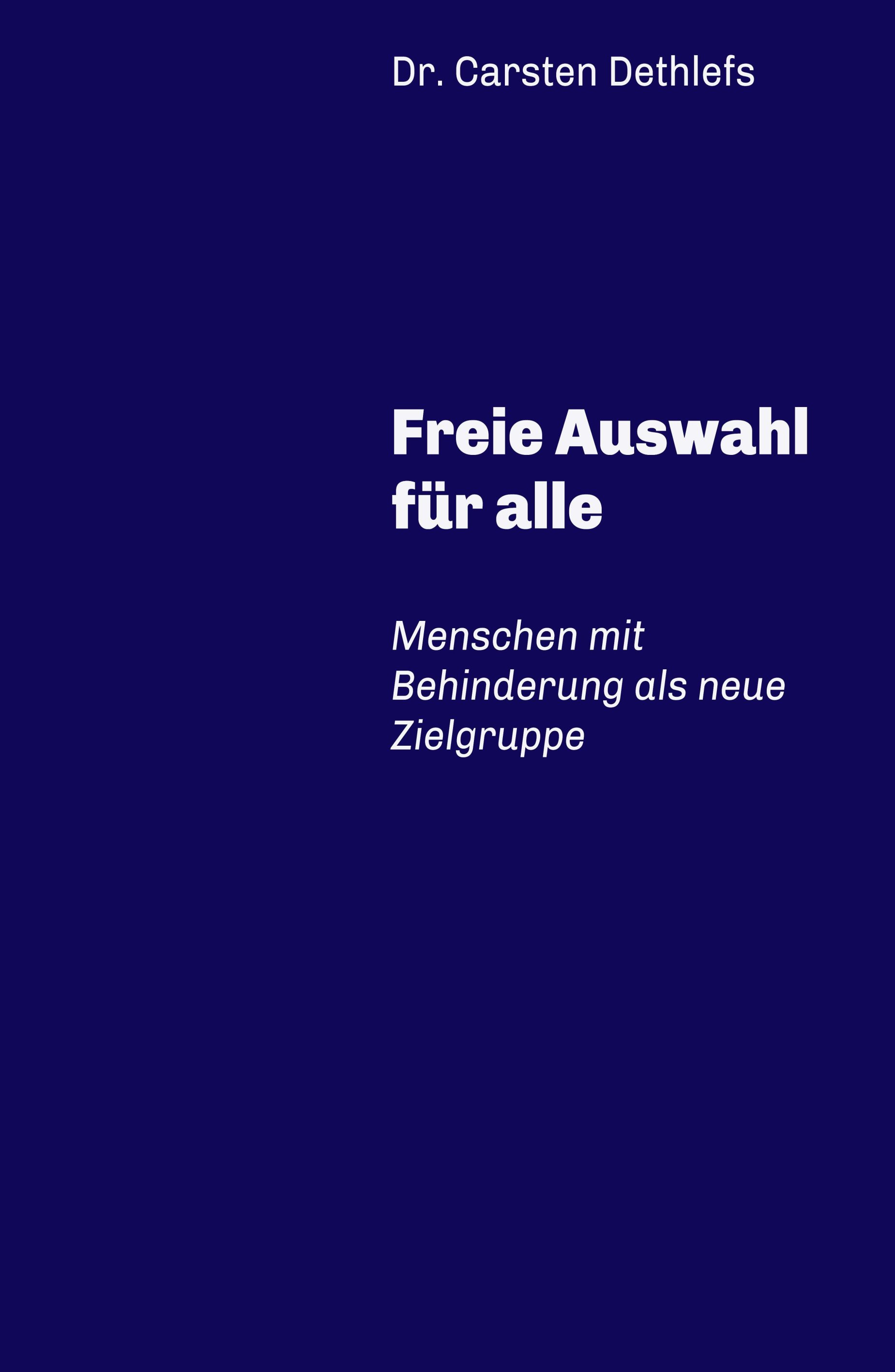 Unter Anderem anhand einer empirischen Erhebung versucht das Buch "Freie Auswahl für alle" die Frage zu beantworten, wie man Menschen mit Behinderung nicht mehr nur länger als "Objekte des Mitleids" wahrnehmen, sondern sie als neuen Markt, als neue Zielgruppe, entdecken kann. Denn eine gedankliche und praktische Umpositionierung von Menschen mit Behinderung würde letztlich allen zugutekommen. Falsches Mitleid ist hier fehl am Platz. Die frischen Ideen in "Freie Auswahl für alle" von Carsten Dethlefs beweisen, dass eine gedankliche und praktische Umpositionierung von Menschen mit Behinderung letztlich allen zugute kommen würde. Das Buch bietet Anhaltspunkte und viel Material für anregende Diskussionen. Es geht um eine Gesellschaft, in der kein Mensch am Rande liegen gelassen wird und in der Behinderungen, sichtbar und unsichtbar, als Chance und nicht als Problem gesehen werden. Wer sich informieren möchte, wie so etwas geht, findet in diesem Buch reichlich Ansatzpunkte und Diskussionsstoff.