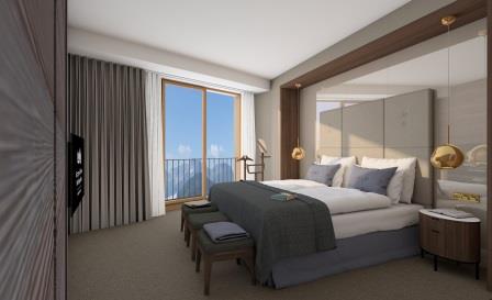 Bei der Wandgestaltung wird ein alpines Ornament aufgegriffen. Durch den Wechsel von glänzender und matter Farbe tritt es auf der weißen Zimmerwand nur in bestimmten Blickwinkeln in Erscheinung. Um das Urlaubsgefühl der Gäste zu vergrößern, werden neue Vorhangsysteme angebracht, die noch mehr Tageslicht durch die großen Panoramafenster fluten lassen. Eine warme, heimelige Atmosphäre entsteht zudem durch ein durchdachtes Beleuchtungskonzept.