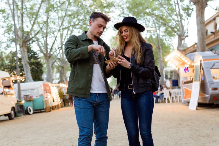 an den fahrbaren Buden, "Foodtrucks" genannt, Fast Food in