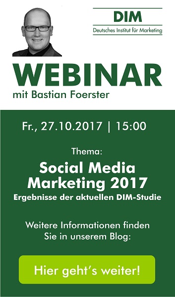 (firmenpresse) - Köln, 18.10.2017: Das Deutsche Institut für Marketing präsentiert das Live-Webinar zu den aktuellen Ergebnissen der Studie "Social Media Marketing 2017". Am 27. Oktober 2017 um 15:00 Uhr findet das Live-Webinar statt. Referent ist Bastian Foerster, Projektleiter am Deutschen Institut für Marketing.