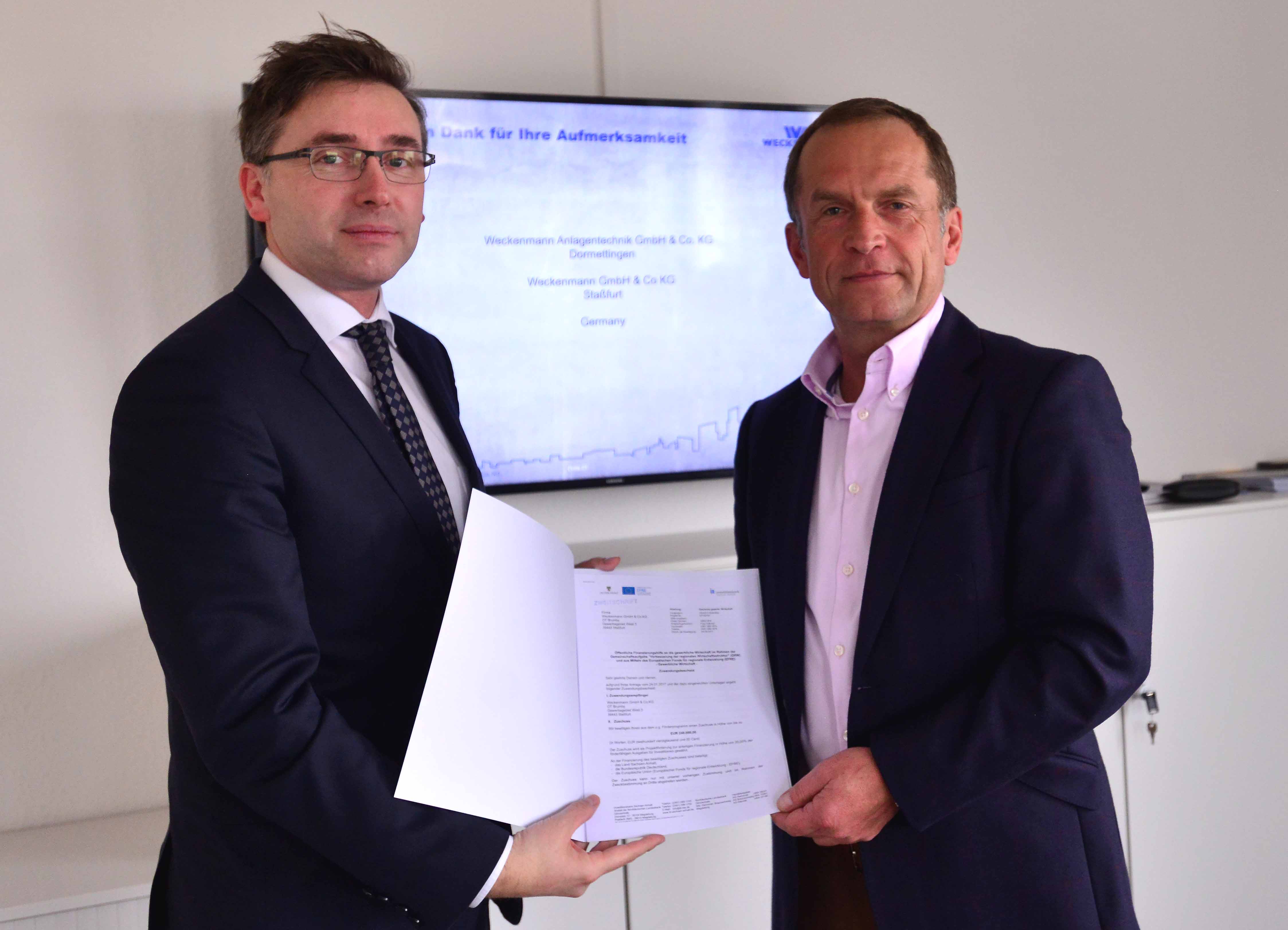 ?Wir sind inzwischen seit fast 25 Jahren hier zu Hause und haben Sachsen-Anhalt als einen sehr leistungsfähigen Wirtschaftsstandort mit hochmotivierten, kompetenten Fachkräften kennen und schätzen gelernt. Wir haben damit eine Verantwortung übernommen, die wir gern tragen. Insofern sind wir sehr froh, dass wir unsere Erweiterungsabsichten jetzt hier in Staßfurt-Brumby an einem modernen Standort umsetzen können, der uns und unserem Mitarbeitern Entwicklungspotenziale für eine gemeinsame Zukunft bietet?, sagte Wolfgang Weckenmann, Geschäftsführer der Weckenmann GmbH & Co. KG heute bei der Übergabe des Fördermittelbescheides durch Wirtschaftsstaatssekretär Wünsch. Wünsch sagte: ?Ich freue mich sehr, dass sich Weckenmann mit der Standorterweiterung zur Region bekennt. Das Unternehmen ist innovativ, weltweit vernetzt und darüber hinaus ein attraktiver Arbeitgeber in der Region. Froh bin ich auch darüber, dass es gelungen ist, für die Erweiterung ein leer stehendes Industrieobjekt zu nutzen. Das Unternehmen kann jetzt schneller expandieren und es gibt eine Industriebrache weniger.?