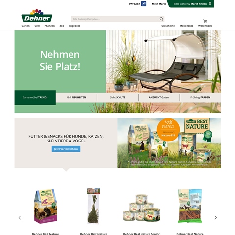 (firmenpresse) - München, 03. Mai 2018. Die überarbeitete Online-Shopping-Plattform von Dehner startet ab sofort unter www.dehner.de mit einem völlig neuen Look. Sie bietet ein einfaches und klares Einkaufserlebnis, geradlinige Strukturen und ein vereinfachtes Navigationskonzept durch optimale Sortimentsaufteilung. Verantwortlich dafür zeichnet die eCommerce Agentur mzentrale, die sich den Etat von Europas größter Garten-Center-Gruppe bereits im vergangenen Jahr nach vorangegangenem Pitch sicherte. Die Agentur mit Sitz in Stuttgart und München ist verantwortlich für Beratung, Konzeption, Design und Frontendentwicklung des neuen Shops.