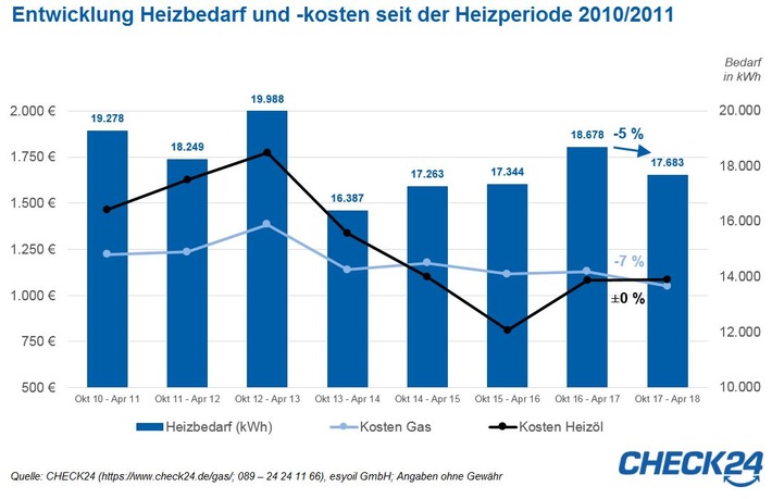 für 20.000 kWh sank gegenüber der Heizperiode 2016/2017 von 1.210