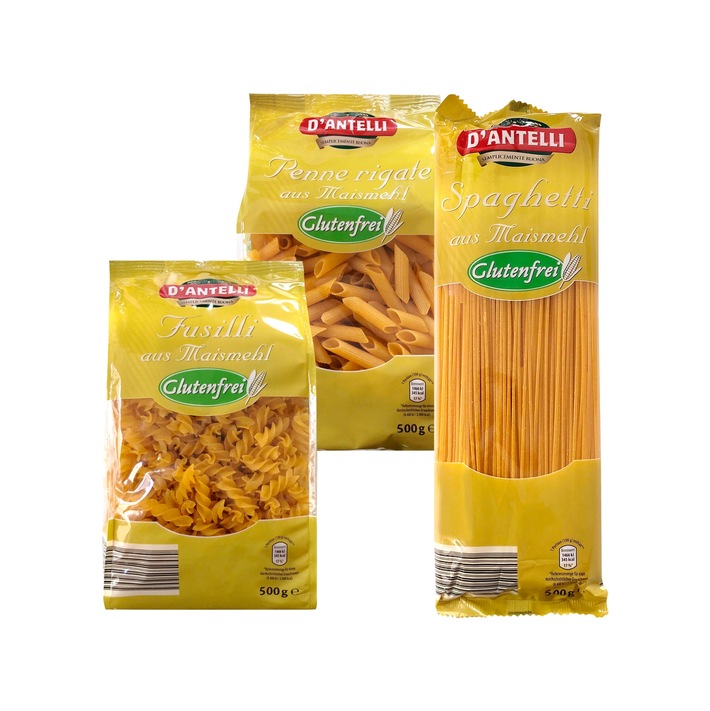 Produkt "D'ANTELLI Maispasta, 500g" in den Sorten Spaghetti, Fusilli