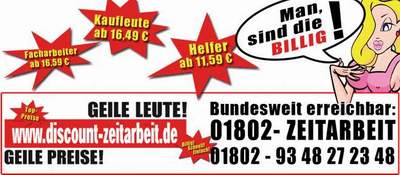 Testen Sie unsere Dienstleistung und besuchen uns unter www.discount-zeitarbeit.de und ordern - einfach - schnell - und billig Ihre kommenden Mitarbeiter.