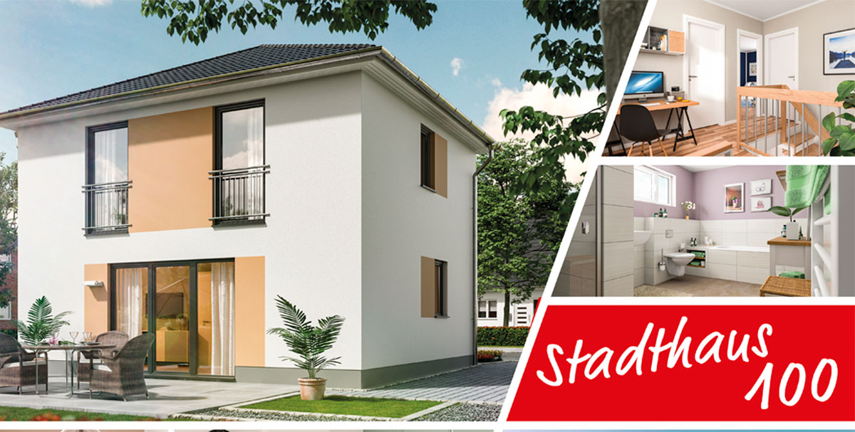 Trotz seiner kompakten Bauweise verfügt das neue ?Stadthaus 100? über ausreichend Platz. Im Erdgeschoss erwartet die Bewohner ein moderner, offener Wohn-, Koch- und Essbereich. Im Obergeschoss laden zwei Zimmer als gemütliche Rückzugsmöglichkeit ein und die Diele bietet kreativen Gestaltungsraum, zum Beispiel für eine Arbeits- oder Hobbyecke. Der Hausanschlussraum sowie der Dachboden sind die clevere und bezahlbare Stauraum-Alternative zum Keller.