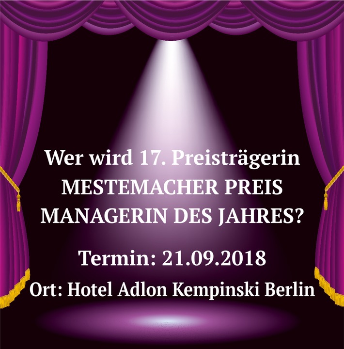 "Einladung zur Pressekonferenz: 17. Verleihung MESTEMACHER PREIS MANAGERIN DES JAHRES / Termin: Freitag, 21. September 2018 - Pressekonferenz: 10:30 - 11:15 Uhr (FOTO)"