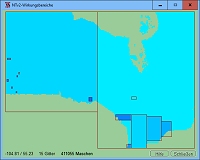Die Wirkungsbereiche aller in der NTv2-Gitterdatei enthaltenen Gitter werden hier in verschiedenen Blautönen angezeigt. Wenn die NTv2-Datei Polygonale Gültigkeitsbereiche enthält, werden nur die Gittermaschen der zur Verfügung stehenden polygonalen Bereiche dargestellt, sonst alle Gittermaschen der quasi-rechteckigen Gitterbereiche. Bis zu einem bestimmten Schwellwert werden die Umrisse der einzelnen Gittermaschen in dunkelblauer Farbe hervorgehoben. Am unteren Rand werden die geographische Koordinate am Mauszeiger, die Anzahl der in der NTv2-Datei enthaltenen Gitter und die Anzahl der Gittermaschen dargestellt. Die Gitterumrisse aller in der NTv2-Gitterdatei enthaltenen Gitter und Subgitter werden als rote rechteckige Rahmen angezeigt.