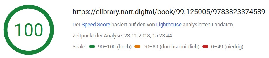 (firmenpresse) - Mehr geht nicht. Mit 100 Punkten erreicht die PubEngine Desktop Version der neuen Narr Francke Attempto eLibrary das absolute Maximum im Google Page Speed Test.