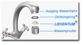 Der Lieventum Wassersparer ist ein kleines technologisches Kunstwerk. Er wird aus Duracon gefertigt, einem hochwertigen, nicht toxischen Kunststoff. Er ist verschleissfest und auch bei höchsten Wassertemperaturen formbeständig. Kalkablagerungen sind unmöglich. Auch die Formgebung ist das Ergebnis langer Untersuchungen. Die Konstruktion ermöglicht es, dass der Wasserdurchfluss um die Hälfte reduziert wird, allerdings ohne dass ein Druckverlust eintritt! Dies ist ein entscheidender Unterschied zu anderen Wassersparern, die häufig den Druck derart beeinflussen, dass Warmwassergeräte nicht mehr ordnungsgemäss funktionieren. Der konstant bleibende Druck sowie die Tatsache, dass der Lieventum dem durchströmenden Wasser zusätzlich Luft hinzufügt, führen dazu, dass der Verbraucher keine Komfortminderung verspürt. Auch mit einem möglicherweise vorhandenem Perlator ist der Lieventum Wassersparer zu nutzen.