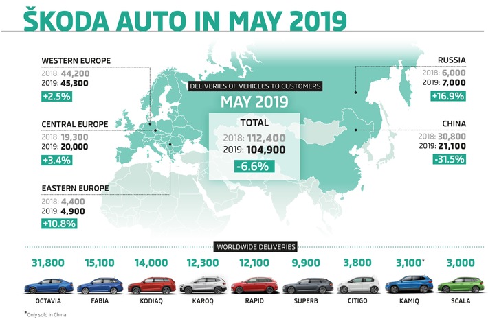 In Westeuropa liefert SKODA im Mai 45.300 Fahrzeuge an Kunden aus