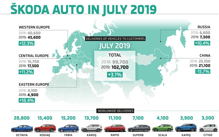 - Auslieferungen: SKODA liefert im Juli weltweit 102.700 Fahrzeuge