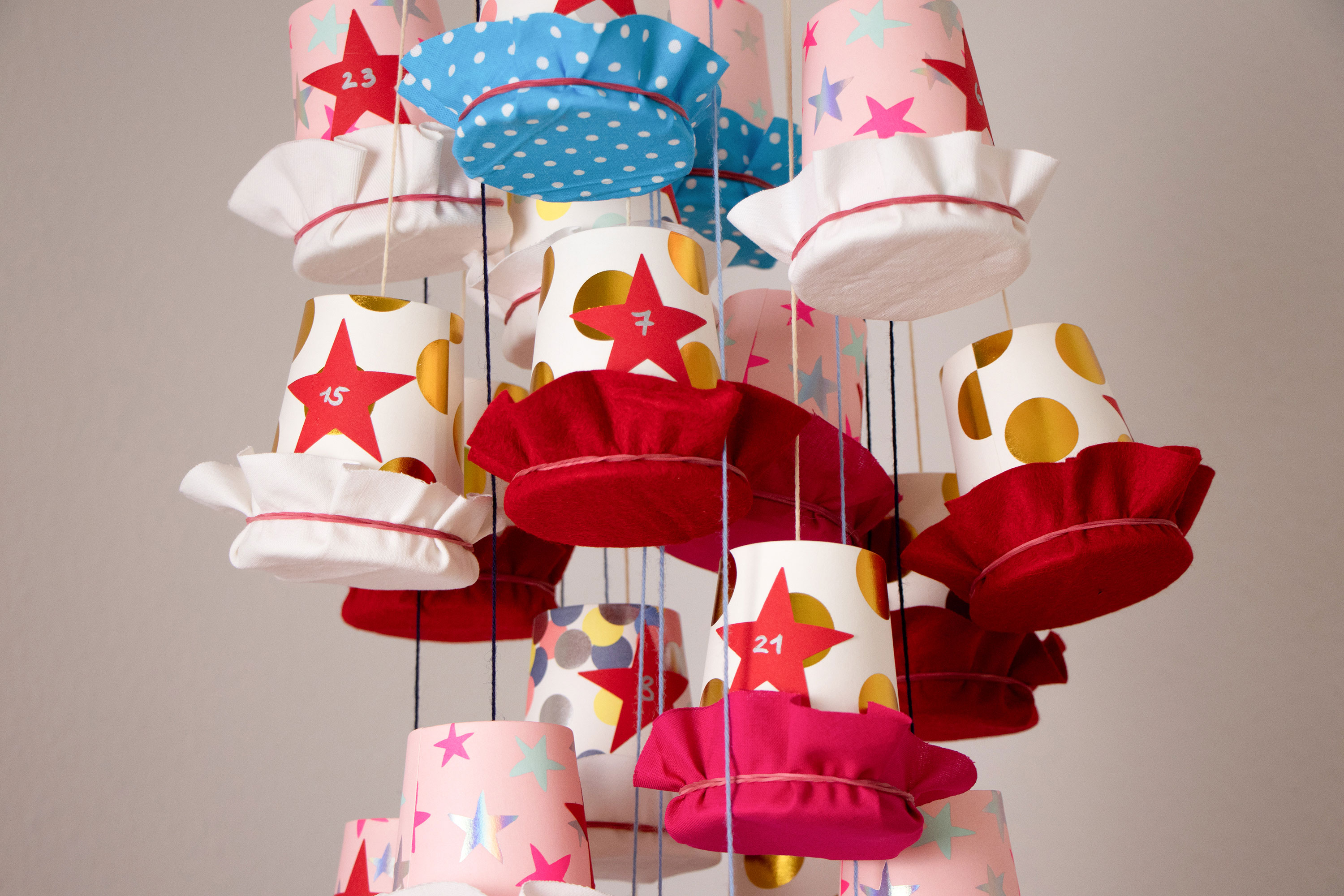 Tipp: Wir haben unterschiedliche und bunte Becher benutzt, da der Adventskalender eine Überraschung für ein Kind sein soll. Natürlich können Sie auch 24 gleiche und schlichtere Becher verwenden.
