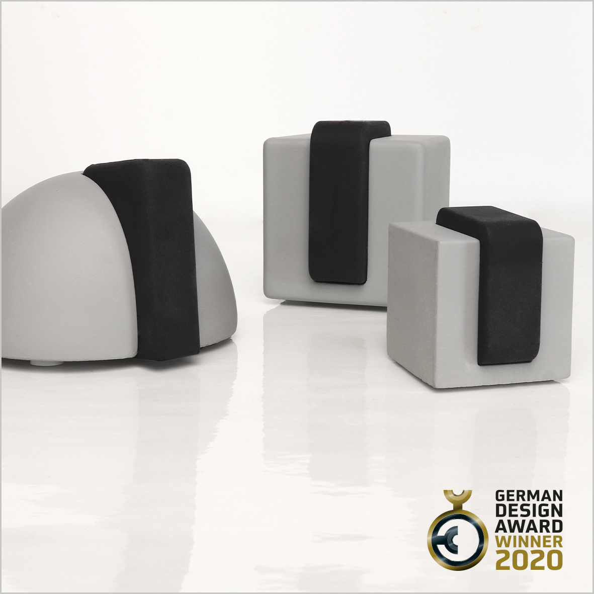 Alle Varianten der neuartigen Stopper-Serie "Concrete" überzeugen durch ihre klare Formensprache und hohe Material- und Verarbeitungsqualität: Die vier neuen Türstopper-Modelle werden handwerklich anspruchsvoll aus feinem Beton im Formgussverfahren hergestellt. Sie kombinieren einen massiven Korpus mit einem elastischen Kautschukelement oder einem Schutzring, der als Prallschutz und Lärmdämpfer fungiert und Türstöße sanft abfedert. Je nach Modell werden die standfesten "Concrete"-Stopper einfach dort platziert, wo sie zum Schutz von Tür, Wand oder Möbel gebraucht werden oder durch Anschrauben fest fixiert.