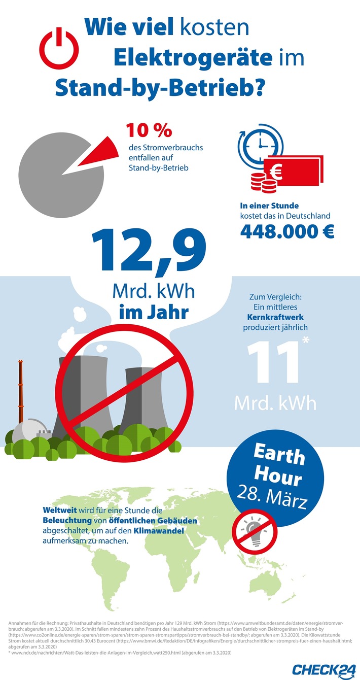 1)Annahmen für die Rechnung: Privathaushalte in Deutschland benötigen pro Jahr 129 Mrd. kWh Strom ( https://www.umweltbundesamt.de/daten/energie/stromverbrauch ; abgerufen am 3.3.2020). Im Schnitt werden mindestens zehn Prozent des Haushaltsstromverbrauchs auf den Betrieb von Elektrogeräten im Stand-by verwendet ( http://ots.de/J0MgiH ; abgerufen am 3.3.2020). Die Kilowattstunde Strom kostet aktuell durchschnittlich 30,43 Eurocent ( http://ots.de/CXVSG8 ; abgerufen am 3.3.2020). - https://www.check24.de/strom-gas/ratgeber/earth-hour-stand-by-kosten/