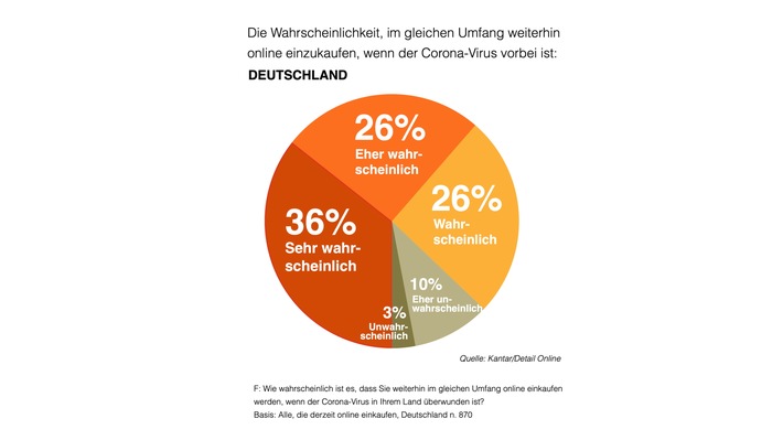 (ots) - Eine von Detail Online im März diesen Jahres in Auftrag gegebene Kantar-Studie, die Europas größte E-Commerce-Märkte Frankreich, Deutschland und Großbritannien abdeckt, zeigt, dass der Corona-Ausbruch die Verlagerung vom stationären Einzelhandel in den Online-Handel verstärkt und zwar schneller als bisher prognostiziert wurde: Die Veränderung des Kaufverhaltens wird durch Corona innerhalb weniger Monate stattfinden statt wie erwartet in drei bis vier Jahren.