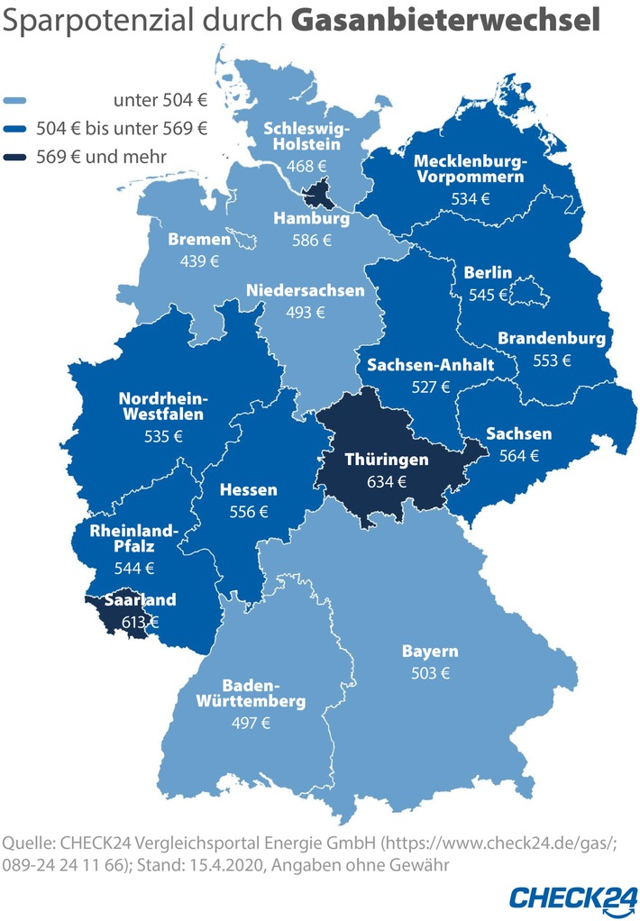 Die mögliche Ersparnis liegt in allen Bundesländern deutlich über 400 Euro im Jahr. Selbst in Bremen sind durchschnittlich 439 Euro drin, wenn sie aus der Grundversorgung zu einem günstigen Alternativanbieter wechseln.