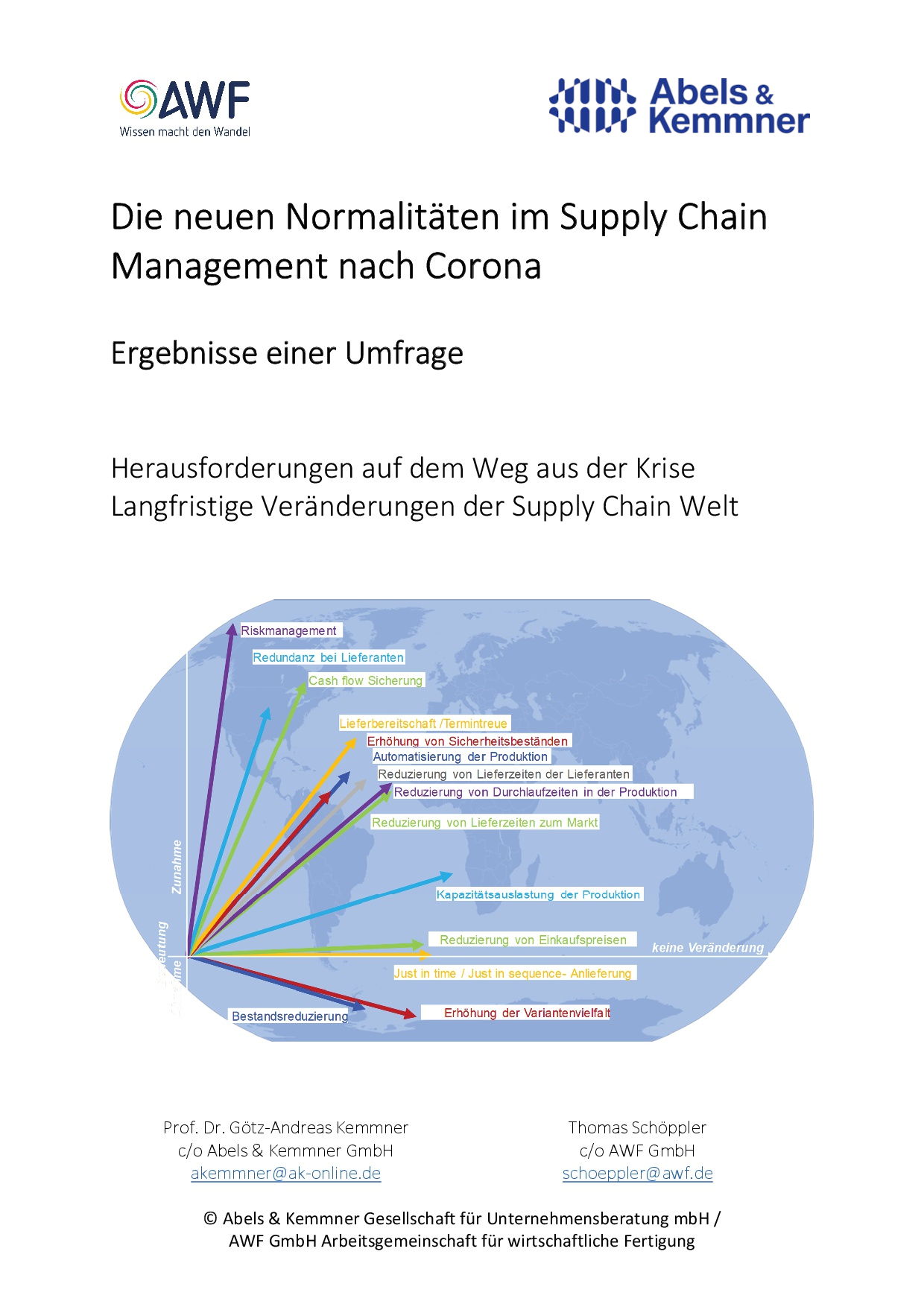Mitte April 2020 führte die Arbeitsgemeinschaft für wirtschaftliche Fertigung zusammen mit der Supply Chain Management Beratung Abels & Kemmner drei Online-Workshops mit Vertretern von 23 Mitgliedsunternehmen durch. In diesen Workshops wurden Erwartungen und Hypothesen zur Entwicklung von Supply Chain Managements und Operations auf dem Wege aus der Corona-Krise und nach der Corona-Krise zusammengetragen. Auf Basis dieser drei Workshops wurde von Abels & Kemmner eine Umfrage erstellt und vom 20. April bis 24 April 2020 durchgeführt, um ein möglichst breites Meinungsbild zu den aufgestellten Erwartungen und Hypothesen zu erhalten. Angesprochen wurden Personen aus Produktions- und Handelsunternehmen, die in den Bereichen Produktion, Logistik, Supply Chain Management, Einkauf und Arbeitsvorbereitung tätig sind, sowie eine kleinere Anzahl an Beratern, die sich mit Logistik, Supply Chain Management und Lean Management beschäftigen. An der Umfrage nahmen 250 Personen teil. Die Ergebnisse dieser Umfragen werden in der nun fertiggestellten Studie dargestellt und interpretiert.