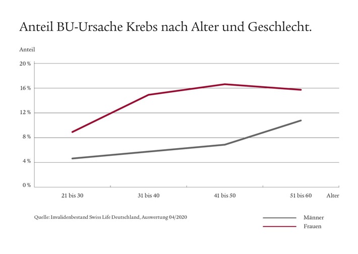 - Frauen im Alter zwischen 21 und 30 Jahren werden doppelt so häufig berufsunfähig wegen eines Krebsleidens wie gleichaltrige Männer. - Zwischen 31 und 40 Jahren sind Frauen mit 15 % anteilsmäßig sogar dreimal so häufig von Krebs als BU-Ursache betroffen wie Männer (5 %). - Bei Männern steigt der prozentuale Anteil von Krebs als BU-Ursache mit 11 % erst zwischen 51 und 60 Jahren deutlich an. - Eine aktuelle YouGov-Studie im Auftrag von Swiss Life zeigt: 60 % der Befragten haben am meisten Angst davor, an Krebs zu erkranken. - Dennoch haben mehr als 80 % der Befragten keine Berufsunfähigkeitsversicherung für den Fall einer schweren Erkrankung abgeschlossen. - Swiss Life bietet mit der Akuthilfe eine Sofortrente bei Krebsleiden.