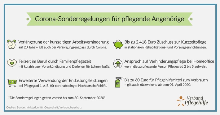 (ots) - In Corona-Zeiten gibt es für die häusliche Pflege eine Reihe von Sonderregelungen. Vielen Betroffenen fällt es schwer, den Überblick zu behalten. Der Verband Pflegehilfe informiert deshalb über die wichtigsten coronabedingten Gesetze und Erweiterungen für Pflegebedürftige, die zu Hause leben und für deren Angehörige.